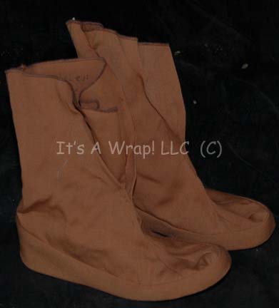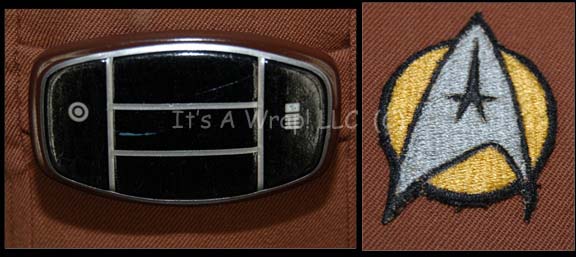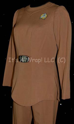 Description: A brown colored Class-A Starfleet uniform featured in Star Trek I: The Motion Picture. The costume is a two piece uniform, a set of brown trousers with affixed negligee that is hidden by the matching uniform top. The top features an affixed bio-monitor and an attached yellow backed Starfleet emblem patch on the left breast indicating the wearer to be a member of the operations division. Also present are a pair of matching cloth covered shoes. The garments both features sewn in Paramount tags reading ‘Celeste Cartier’.