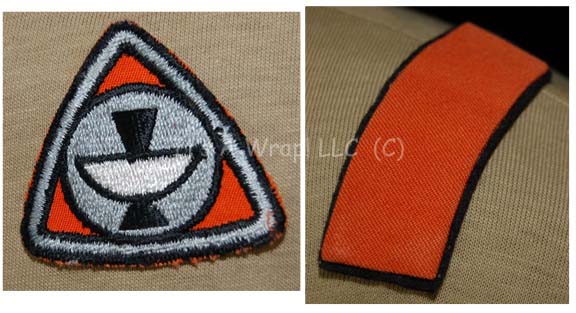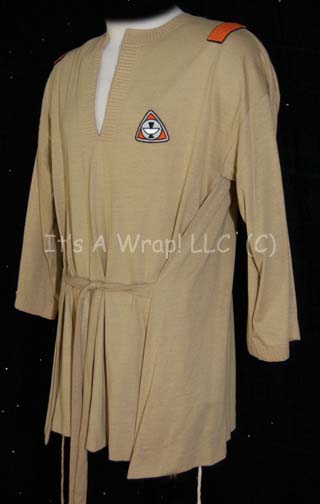 Description: A Starfleet casual uniform top featured in Star Trek I: The Motion Picture. The costume is an “Epsilon IX” duty uniform top composed of a khaki cropped sleeved shirt with crimped trim around the collar and sleeve cuffs, and a waist tie, a sciences orange “Epsilon IX” assignment patch on the left breast and a pair of orange division strips affixed to the shoulders. The costume features a sewn in Western Costume Co. tag indicating it to be size ‘40’.