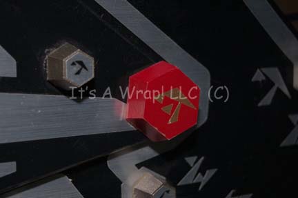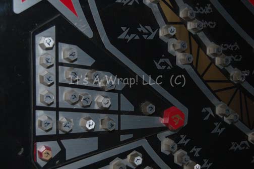 Description: A piece of set dressing featured in the ninth Star Trek feature film “Insurrection”. This item is a control console from one of the Son’a ships; it is a rectangular piece of smoked acrylic with a graphical application adhered to the reverse, silver and red colored applications applied to the front, silver Son’a iconographic symbols, and numerous plastic, hexagonal faux knobs and switches with similar symbols on them, on a silver background, and arranged into groups. A second, raised, roughly triangular piece of smoked acrylic is adhered to the front with matching symbols and faux knobs including one large red knob with gold-colored script and one smaller one with gold background instead of silver. The item measures approx. 23 X 16 inches.