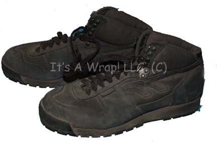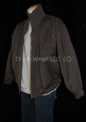 Description: A costume featured in Star Trek V: The Final Frontier for wear by Walter Koenig in his portrayal of “Chekov” during the scene in which he and “Sulu” (George Takei) are lost in the woods during shore leave. The costume is a pair of dark blue denim trousers, a gray ‘Levi's Silver Tab’ name brand sweatshirt, and an ‘Umberto Ginocchetti’ name brand jacket made from brown and black corduroy-like material with a zip front, an oversized collar, asymmetrical button flap waist pockets, and flap pocket accents bordering the chest and an elastic waist, with a pair of leather and canvass lace up hiking shoes which retain a minute degree of natural foliage in the treads from production use. The shoes were located with a costumer’s tag inscribed ‘Chekov’, and the trousers are inscribed ‘Chekov’ on the interior. A costumer’s tag included reads ‘Star Trek V, Walter Koenig as Chekov, CHG #1, SC#40-41’.