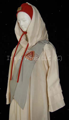 Description: A costume believed to have been featured in Star Trek III: The Search for Spock. The costume consists of a long-sleeved, full-length, off-white robe featuring wide, pleated sleeves with a sewn in hood, a gray, ceremonial sash featuring a metallic silver-colored inset with gold-stitched Vulcan-themed glyphs, a triangular, gold-colored “jewel” with a matching Vulcan iconographic symbol inside, and a rust-colored cowl/hood, holes for the ears and a similar gold-colored “jewel” and symbol inside it. Some light points of spotting are present on the front of the robe around the right knee.