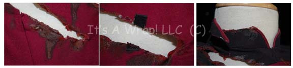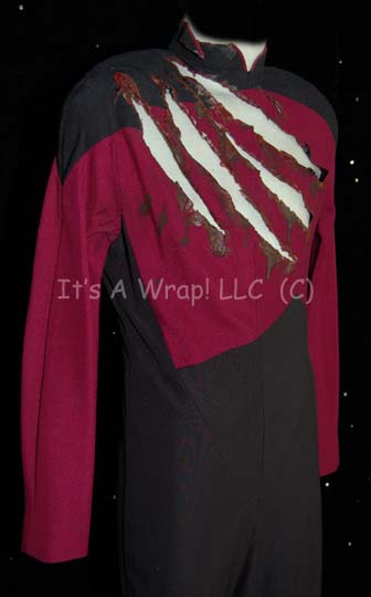 Description: A costume featured in the Star Trek: The Next Generation episode “Genesis”; wherein “Captain Picard” (Patrick Stewart) and “Lt. Commander Data” (Brent Spiner) return to find the “Enterprise-D” adrift and populated by de-evolved versions of the crew. This costume is a Starfleet uniform jumpsuit that has been severely distressed to emulate an attack by the de-evolved version of “Lieutenant Worf” (Michael Dorn); it is a long-sleeved, full-length black jumpsuit with Command Red across the chest, back, sleeves and in piping around the collar, a Velcro patch for a commbadge (not included), a zip down the front and stirrups for the feet. The costume has a series of large rips across the front like it was swiped at with a set of sharp claws and caked, dry stage “blood” around the rips. There is no sewn in tag other than a size tag but a costumer’s tag reads ‘#101, Red, TNG’.