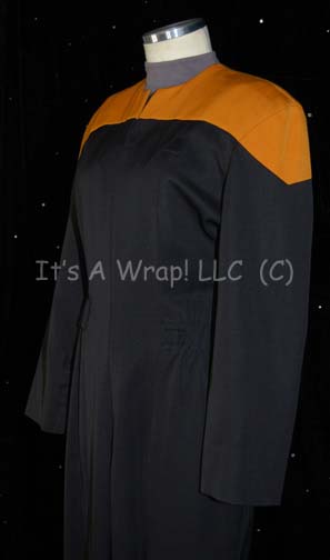 Description: A costume featured in various episodes of Star Trek: Voyager. This costume is a long-sleeved, full-length black jumpsuit featuring Operations Gold division colors around the shoulders, hoops at the waist for away team gear, a Velcro patch for a commbadge (not included), stirrups for the feet, and a long-sleeved, blue/gray undershirt. A sewn in Voyager tag in each garment denotes wear for “Joan Valentine” and a costumer’s tag reads ‘Joan Valentine, 7 heels Gold, Voyager’.