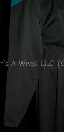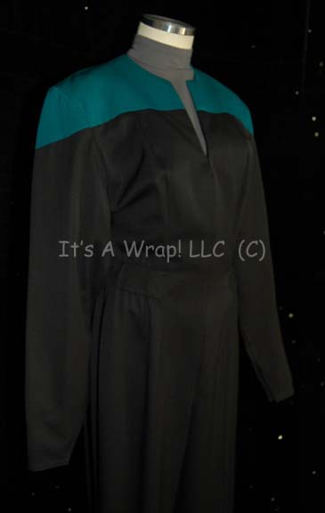Description: A costume featured in various episodes of Star Trek: Deep Space Nine. This costume consists of a long-sleeved, full-length, black jumpsuit featuring Sciences Blue division colors around the shoulders, an open collar, a Velcro patch for a commbadge (sold separately), hoops at the waist for ‘away team gear’, and a long-sleeved, blue/gray undershirt. A sewn in Deep Space Nine tag in the jumpsuit reads ‘Terry Farrell’ and a tag in the undershirt reads ‘K. Lesko’.