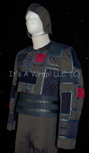 Description: A costume featured in the Star Trek: Voyager episode “The Raven”; wherein "Seven of Nine" (Jeri Ryan) begins to hallucinate as her Borg components reassert themselves and she fears she is being called back to the Collective. This costume consists of a long-sleeved, iridescent blue jumpsuit with a zip up the back, a cropped, iridescent-blue jacket featuring turquoise trim, blue and red geometric shapes, Velcro at the front, and a wide, suede, blue cummerbund with dark-blue leather stripes. A sewn in Voyager tag on both items reads ‘Richard Zobel’, a costumer’s tag reads ‘174 The Raven, Gauman, Richard Zobel’ and a costumer’s tag denotes the item for later wear by ‘Vincent Muller’.