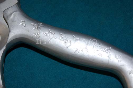 Description: A prop ‘Nisroh’ knife like the one featured in the Star Trek: The Next Generation episode “Frame of Mind”. The item is a sturdy molded rubber prop knife with beveled edge4s to appear sharp, with molded etchings on the grip and a faux metal pommel. The item measures approx. 16.5 X 6.75 X 0.75 inches and is painted metallic silver.