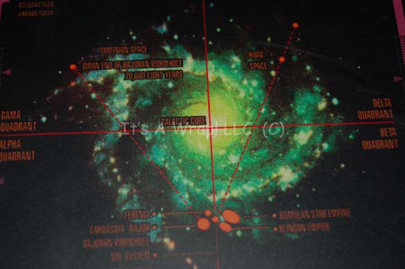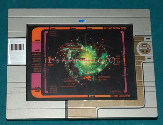 Description: A prop PADD (Personal Access Display Device) believed to have been featured in Star Trek IX: Insurrection on the deck of “Captain Picard” (Patrick Stewart). The item is a medium sized injection molded plastic device with a centered ‘display screen’ that features an adhered graphic of the ‘Milky Way Galaxy’ as depicted in Star Trek episodic television and feature films. The graphic features a rendering of the galaxy sectioned into its four quadrants labeled ‘Alpha’, ‘Beta’, Gamma’, and ‘Delta’, and shows the location of ‘Borg Space’, ‘Sol System Federation Starfleet HQ’, the ‘Romulan’ and ‘Klingon Empire’, other native alpha Quadrant species and the terminus of the ‘Idran End of the Bajoran Wormhole’ and what is believed to be the route taken by the “U.S.S. Voyager” crew. The item is painted metallic silver with metallic gold adhesive details and accents. An asymmetrically placed battery pack is housed on the reverse with a cover plate for the battery positions. The item can be powered by 2-3 9volt batteries, one set of battery leads are floating free of the others and the backlit display is capable of being powered by two sets of leads and batteries. A switch on the side activates the back light and illuminates the ‘display screen’. An AC adaptor input is present next to the switch for an unknown power supply that is not present. The item measures approx. 11 X 8.5 X 1.25 inches. All batteries not included. Item Numbe 6746