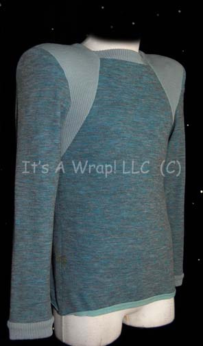 Description: A costume shirt featured in the Star Trek: The Next Generation episode “The Game”, wherein “Wesley Crusher” (Wil Wheaton) returns on holiday from Starfleet Academy and finds everyone addicted to a new game “Commander Riker” (Jonathan Frakes) had brought back from Risa with a psychotropic “reward” system. The shirt is blue/gray with textured fabric at the neckline and around the shoulders and cuffs. The costumer’s tag reads ‘1 shirt-blue, gray, fleck, “Wesley” Will Wheaton, #206 The Game’.