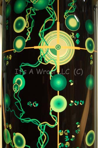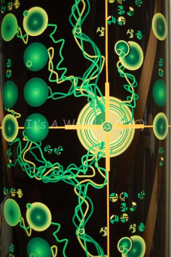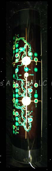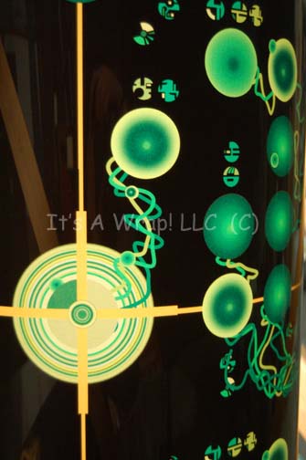 Description: A large prop item featured in multiple episodes of Star Trek: Voyager like “Drone” for use as a Borg themed computer interface. The item is rounded smoked acrylic with a graphical application applied to the reverse that is best viewed when back lit by an external light soured. The display graphic appears as a multi-colored green themed series of faux buttons and readouts in the Borg language. The item features screw holes for mounting into a frame, the graphic does not occupy 6.5 and 8 inches at the ends because the item was originally mounted in a frame that covered this area. The item measures approx. 15.75 X 8.5 X 72 inches.