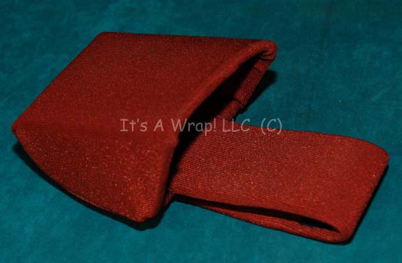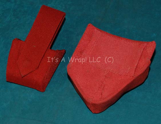 Description: A pair of holsters created for Bajoran military costume uniforms featured in episodes of Star Trek: Deep Space Nine. One item is for equipment and is constructed from fashioned leather wrapped in rust colored spandex fabric with a belt loop that snaps over the belt and features a Velcro placement at the top of the loop interior. The second item is for a Bajoran phaser pistol made from vacuum formed plastic with a similar rust colored spandex fabric covering and a sewn in belt loop. The phaser pistol fabric is slightly darker than the equipment holster, due either to purposeful distress or darkening for dimension. The items measure approx. 6.75 X 2w.75 X 3.75 inches and 3.25 X 5.75 X 6.25 inches.