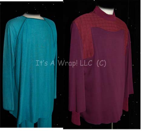 Description: A lot of three costumes featured either in the pilot episode of Star Trek: Deep Space Nine “Emissary” or in various episodes of the first season. The first costume consists of a red shirt with black flecks in a textured, diamond pattern, matching trim just off the shoulders, a zip up the back, teal, corduroy trousers with green accents, and attached suspenders. A sewn in tag denotes further use in Voyager and the costumer’s tag reads ‘Pilot DS9, Jake Sisko, Cirroc Lofton. The second costume consists of a long-sleeved, full-length, brown jumpsuit featuring viridian-colored shoulders with gray and magenta colored accents and the third costume is a similar jumpsuit in an olive color and dark green sleeves and shoulders. The second and third costumes both include costumer’s tags that identify them as for wear by Cirroc Lofton in the first season of Deep Space Nine.