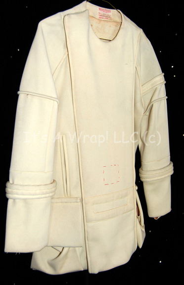 Description: An unfinished Starfleet away team field jacket like those featured in Star Trek II: The Wrath of Khan for wear by William Shatner in his portrayal of “Admiral Kirk”. The item is made from off white colored un-dyed fabric with multiple sewn in raised accents for a busier appearance. The item features a high degree of deteriorated foam interior lining that has collected in the folded up hems that are not sewn shut. The pockets also have collected a degree of this same material, it has not detracted from the overall external appearance of the item. The asymmetrical front seals through the use of Velcro placements; the costume features two front and reverse flap pockets and a pair of hand pockets. A sewn in Western Costume Co. tag reads ‘William Shatner’.