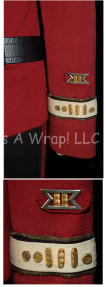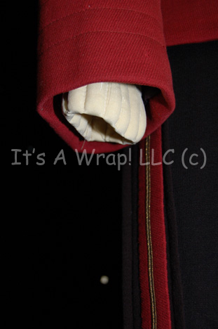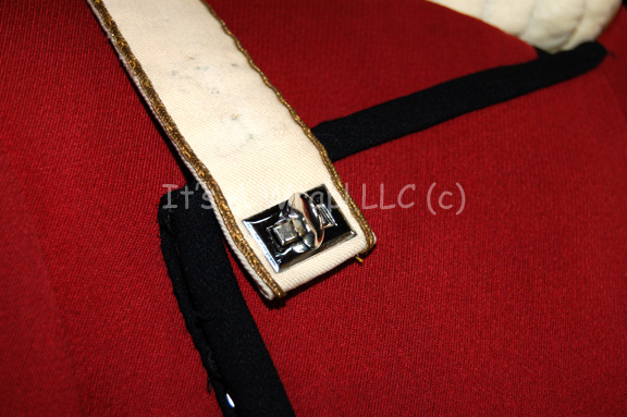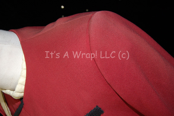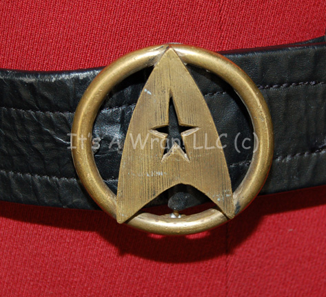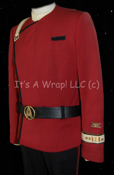 Description: A Starfleet officer’s costume like those featured in Star Trek II: The Wrath of Kahn through opening scenes of Star Trek VII: Generations. The costume consists of a long-sleeved, maroon uniform jacket featuring a tan under-flap, chain accents in between the snaps, black piping, white Command division strip for the right shoulder with resin ‘security-disk’ that is very loose, moderate fading along the shoulders and sleeves, Velcro patch on the left breast for a Starfleet insignia which seems unique to this uniform, black loops for an accompanying black leather belt with gold colored metal Starfleet logo buckle, an attached silver and gold colored metal badge and placement on the left wrist denoting the rank of ‘commander’, a white Command division strip along the cuff featuring black and gold piping, three gold-colored metal pins with the Starfleet symbol each denoting ten years service; three oval shaped, gold-colored Starfleet commendation bars, a long-sleeved Command white undershirt with collar ribbing, black, overall-style trousers, and matching maroon and gold stripes down the legs. An accompanying unattached metal ‘commander’ rank badge is present for the shoulder division strip.