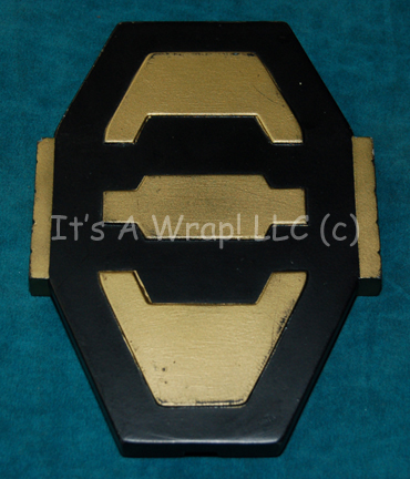 Description: A prop item featured in the Star Trek: Enterprise episode “Borderland. This item is a PADD (Personal Access Display Device) like those appearing in the slave auction scene and is a roughly octagonal in shape, black resin cast with textured, silver, vertical recesses on the top and bottom; gold-colored accents on the front and back, and a circular ‘display screen’ inset featuring an iridescent black graphical application of Orion iconographic lettering in silver meant to represent slave auction bids with a the third line highlighted in light green. The item measures approx. 7 X 5 X 0.5 inches. A degree of contact scratches and rubbing is present on the raised molding.