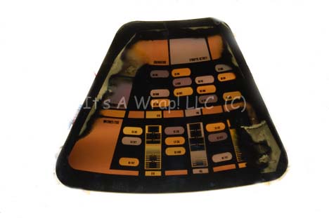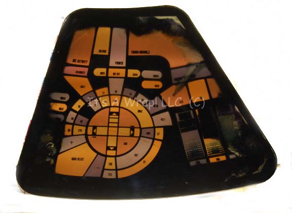 Description: A set of three LCARS (Library Computer Access and Retrieval System) style panels believed to have been featured in the Star Trek: Voyager episode “Life Line” on the Jupiter Station set and the offices of “Dr. Lewis Zimmerman” (Robert Picardo). The items are smoked acrylic panels shaped to be inset to a round console, with graphical applications adhered to the reverse that depict 24th century style LCARS displays and interfaces. The display graphics themselves have suffered a degree of liquid damage and the colors have bled into each other. The items measure approx. 12.5 X 15.25 inches.