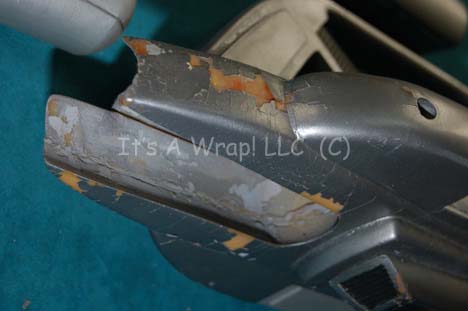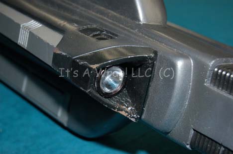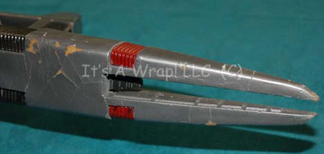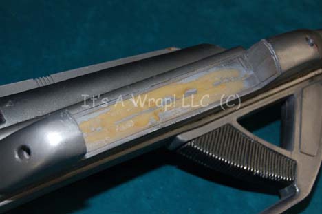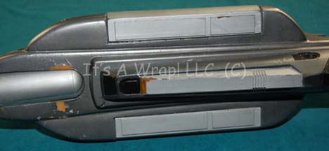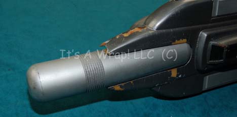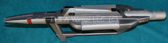 Description: A molded rubber prop Starfleet compression phaser rifle like those appearing in various episodes of Star Trek: Voyager. The item is painted two tones of metallic silver, features a later series ‘scope’ with a light mount facing forward that has not proven to function for anything other than its presence, and a cut out in the hand grip for thumb placement. The item is accompanied by two no longer affixed elements, a silver colored tube end that functions as the butt of the item and a side positioned bracket that mirrors the other still attached one on the other side. The item depict in two places specifically cracking in the paint at the front emitter end and where the rifle butt fits into the stock. The hand grip element is peeling away from the stock. Other areas of flaking in the paint are visible and some streaks due to storage. When all corresponding elements are fastened in place, the item measures approx. 33.25 X 6 X 10 inches.