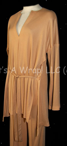Description: A costume featured in Star Trek I: The Motion Picture. This costume consists of tan colored trousers and a matching long sleeved shirt with a waist tie and a ribbed v-neck, the item features a Western Costume Co. tag and is intended for female actors.