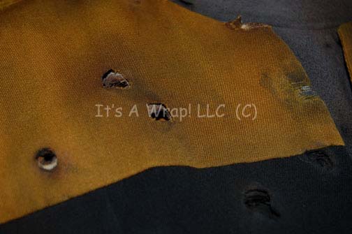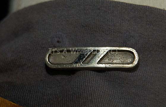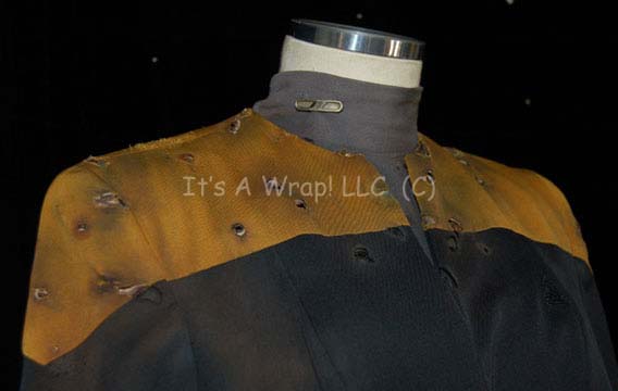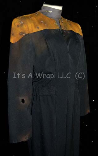 Description: A costume featured in various episodes of Star Trek: Voyager. This costume is a Voyager/Early DS9 Starfleet uniform consisting of a long-sleeved, full-length, black jumpsuit featuring Operations Gold division colors around the shoulders, ‘away team gear’ loops at the waist, a Velcro patch for a commbadge (sold separately), and a metal, provisional rank pin of Lieutenant Junior Grade that attaches to the collar of the long-sleeved, blue/gray undershirt. The jumpsuit is intentionally distressed in the form of various burns, tears, and stains all along the front, minor stains and tears down the back and on the undershirt. A sewn in Voyager tag in the jumpsuit reads ‘Roxann Dawson’, a second tag has faded but is the name ‘Roxann’ is still legible, and a matching tag on the undershirt reads ‘Roxann Dawson’ as well.