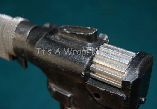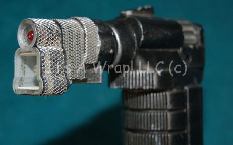 Description: A prop item similar to those featured throughout Star Trek episodic television. This item is composed of a black, acrylic handle vaguely the shape of a modern-day cordless drill, textured accents around the finger grip, copper-colored “button” on the bottom, a button that activates the untested electronics at the back of the “handle”. Silver-colored, textured accents at the back of the “barrel”, a grooved aperture that suggests something else can be attached to it; a vaguely key-shaped emitter tip featuring metal screen around a top red light and a bottom clear one. Two screws on the back of the handle give access to the battery compartment and the two N-sized, 1.5 volt batteries that power the device. The item measures approx. 6.5 X 4.5 X 2 inches.