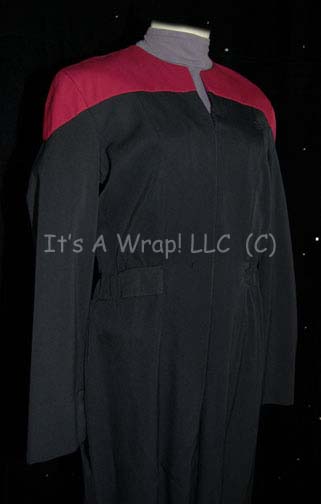 Description: A costume featured in various episodes of Star Trek: Voyager. This costume is a Voyager/earlier DS9-style Starfleet uniform consisting of a long-sleeved, full-length, black jumpsuit featuring Command Red division colors along the shoulders, sewn in ‘away team gear’ loops around the form-fitting waist, a Velcro patch for a commbadge (not included) on the left breast, a zip down the front, and a long-sleeved, blue/gray undershirt that has its own zip down the back The Command Red coloring around the shoulders has sustained very minor fading. A sewn in Voyager tag that reads ‘Jackie Rainey’ is present in both garments but the jumpsuit features a second one that reads ‘Size 10, #170’ and the undershirt has a second one that reads ‘Size 6’.