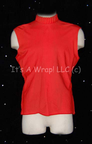 Description: A costume item featured in various Star Trek feature films from “The Wrath of Kahn” to the opening scenes of “Generations. This item is a sleeveless, Starfleet uniform undershirt in Cadet/Trainee Red with a ribbed collar, clasps at the neck, and zip down the back. The item is a size 40 and made for men.