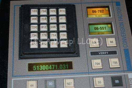 Description: A prop computer interface panel featured in various episodes of Star Trek: Enterprise. The item is a piece of smoked acrylic with a graphical application adhered to the face and reverse of the item. The graphic on the reverse is multi-colored and visible when back lit by an external light source through the face where the graphic there is cut out. They appear as indicator lights. The face is adorned with multiple rubber faux buttons and a bank of depression buttons with numeric values adhered to them. The item is inscribed ‘Conversion Factor’ and measures approx. 7.75 X 8.25 X 0.25 inches.