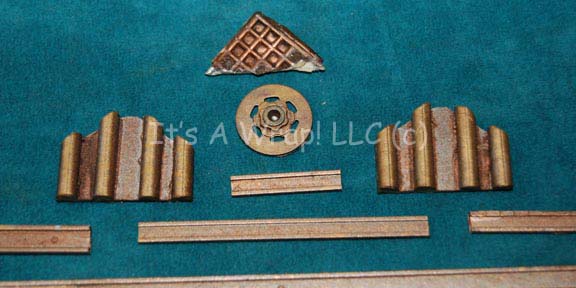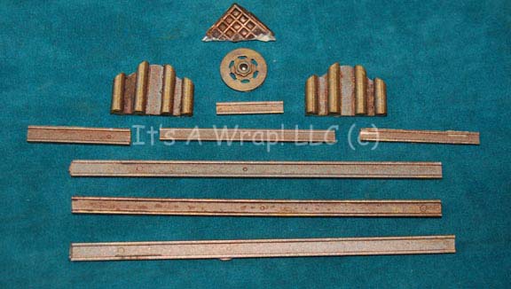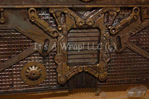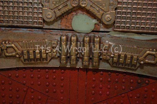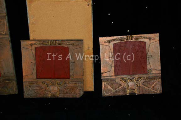 Description: A model piece comprising the interior of a turbo lift shaft featured in various episodes of Star Trek: Deep Space Nine. The item is made from a wood frame backing with adhered resin molded turbo shaft doors painted metallic copper with rust colored doors. The item is encased in its own customized wooden crate. The molded resin panels make up the model, the adhesive quality has faltered with time and the elements of the model are coming off the wood. Small bits that add detail have come off but are accompanying. In its crate the item measures approx. 67 X 5 X 14 inches.