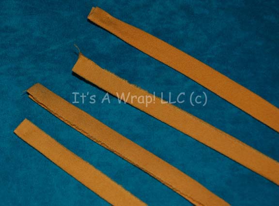 Description: A pair of fabric strips featured on the costume trousers of Starfleet uniforms in Star Trek feature films. The items are folded over and stitched sealed; meant to be sewn onto the outside seam of trousers to indicate the wearer to be a member of the operations division. The items are 54 inches long and retain threads from removal.