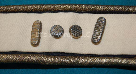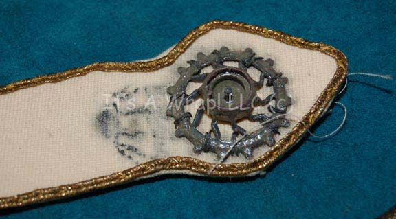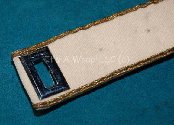 Description: A lot of two costume accents appearing in Star Trek feature films on Starfleet officers in the command division. One item is a white fabric strip on black felt bordered by gold colored trim made for the left forearm sleeve of an officer’s uniform (sold separately). The item is accented by a pair of silver colored metal ‘5 year’ service pins painted gold and two similarly fashioned commendation bars all affixed to the strip. Also accompanying is a shoulder division strip made from white fabric with gold trim, the item is adorned by a unique molded plastic ‘security disk’ and a clasp guard. The item depicts a degree of staining in front of the disk and the opposing end retains puncture marks and indentations where a badge of rank was removed prior to the auction. The items both retain loose threads from costume removal.