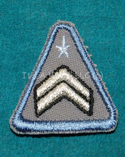 Description: A MACO (Military Assault Command Operations) rank patch created for use in various episodes of Star Trek: Enterprise. The item is a triangular patch colored blue with a white star and two white chevrons indicating the wearer to be a ‘corporal'. This item would be worn on right sleeve of a uniform top and features remaining threads from costume use.