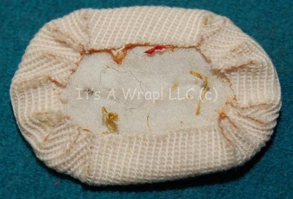Description: A costume accessory rank placement for a Starfleet uniform like those appearing variously in Star Trek feature films. The item is an oval shaped white fabric piece folded over for neat edges with white batting inside for width made for placement on a Starfleet engineer’s white radiological uniform. The item is capable of receiving these ranks: lieutenant (junior grade), lieutenant, commander, captain, and commodore. It measures approx. 1 X 2 inches and retains yellow threads from badge removal prior to auction.