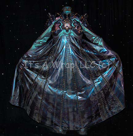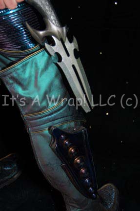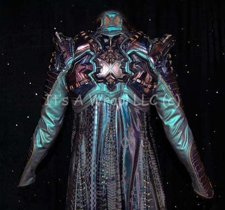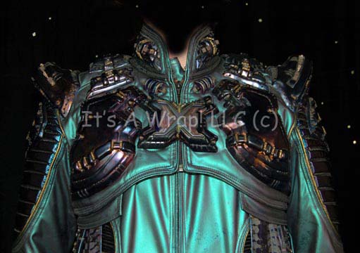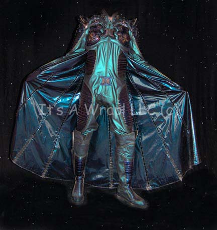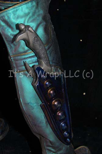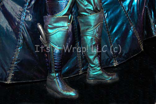 Description: An incredible stunt costume in excellent condition featured in Star Trek X: Nemesis for wear by Todd Bryan while performing stunts as the “Reman Viceroy”. The costume is made from shiny iridescent purple material with multiple molded accents and sewn in metal embellishments. It is composed of these separates: A black undershirt to prevent chafing, a set of overalls, a full length cape, a uniform jacket with shoulder armor, and a pair of knee high boots. The boots feature zips up the back of the leg, thick soles, and a sheath on the right outer leg for an accompanying prop knife. The knife is molded rubber with a blade separation, a spiked pommel and finger guards; the ‘blade’ points on the ends are broken off revealing the metal interior framework, the item is painted olive green with a black handle. The overalls are purple with multiple padded points and matching material over the shoulders and around the arms, Velcro placements correspond to the cape. The cape is inscribed internally ‘Ron #1’ for Ron Perlman who portrayed the “Reman Viceroy” in the film, it is nine lengths of iridescent purple material with painted on patterns, all formed together with metal work, with holed openings for the arms made from olive colored fabric. The uniform jacket matches the overalls, is inscribed internally ‘Todd’ and ‘Ron stunt’, is long sleeved with inside wrist zips, gold colored piping, molded ‘armor’ pieces affixed to the chest, back, and shoulders, and cropped to the upper chest with a center zip that is hidden by a molded ‘X’ embellishment. The costume also comes with a molded Reman ‘X’ ‘buckle’ accent to affix to the Velcro placement waist high on the overalls. The overalls legs fit neatly into the boots when they are zipped up, the calves of the legs and the hem are unfinished. A portion of the chest on the overalls right breast features a sewn in patch with a hole in it possibly for a special effects squib burst.