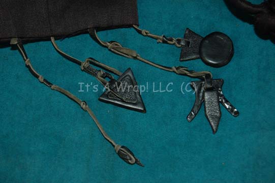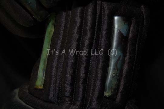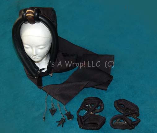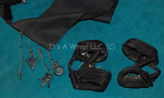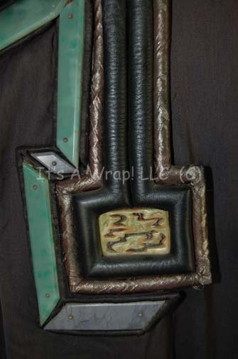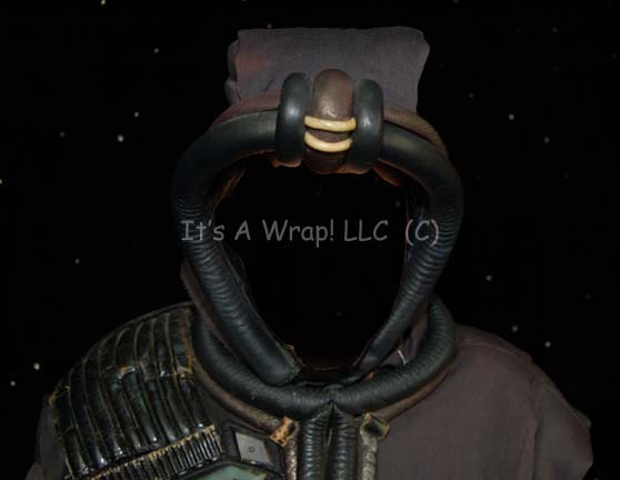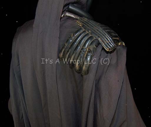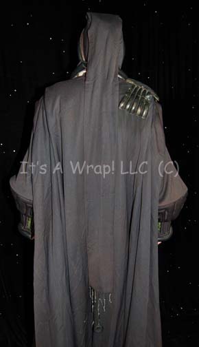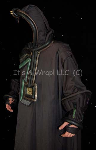 Description: A Megarite alien costume featured in Star Trek I: The Motion Picture and likely in Star Trek IV: The Voyage Home and Star Trek VI: The Undiscovered Country. The item is a large back robe with long sleeves adorned by oversized bracelets, collar and chest decorations, and a hood. The costume accents are made to appear as though they are composed of geologic material, some of it is jade colored and believed to be plastic. Fingerless gloves accompany the item, the sleeve cuffs are made with Velcro placements to fit around the wrists, a large zipper runs up the spine, and the hood features a long tail down the back.