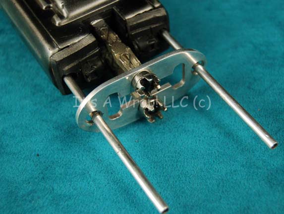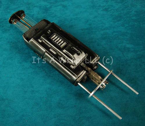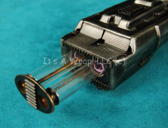 Description: A prop item featured in the Star Trek: Voyager episode “Juggernaut”; wherein Voyager finds a critically damaged Malon freighter that, if it explodes, will infect and entire sector with deadly radiation. This item, the subdermal injector, is the Malon equivalent of a hypospray and consists of a dark-gray, heavy molded-plastic frame with textured accents meant to denote circuitry or function, a silver-colored screw on the top, two “sample vials” sticking out the back that disappear partly into the body of the item, a metal-colored front support with two matching tines that spring back out into position when pushed into the device. The item measures approx. 12.5 X 3 X 2 inches.