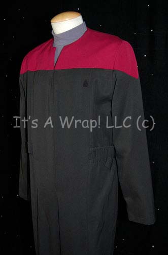 Description: A costume similar to those featured throughout Star Trek: Voyager. This Starfleet uniform jumpsuit is black with Command Red division colors along the shoulders that zips up the front and clasps at the top, and features a Velcro patch on the left breast for a Starfleet ‘commbadge’ (sold separately). The waist features form fitting black elastic with sewn in loops for ‘away team’ gear, the feet end in black elastic stirrups. The costume comes with a gray turtleneck undershirt that zips up the back. A sewn in Voyager tag in the jumpsuit denotes wear by ‘J. R. Quinonez’, primary stand in for Robert Picardo and the undershirt features a blank Voyager tag whereas both feature a second tag reading ‘Size 42’.