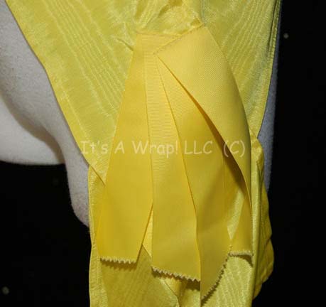 Description: A yellow nylon sash worn by Vulcan delegates at the Khitomer Conference in Star Trek VI: The Undiscovered Country. Seen on background Vulcan attendees this sash is worn from the right shoulder down across the body to the left side where it exhibits a quartet of ribbons cut in various swaths. An excellent piece by itself, or as an accent to an already existing costume. A degree of fading on virtually all of the sashes has occurred generating a slight discoloration.
