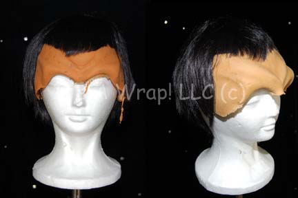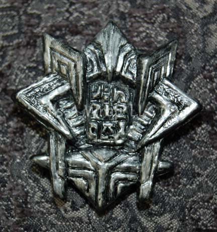 Description: A costume similar to those featured in the later seasons of Star Trek: Deep Space Nine. This costume consists of a half-sleeved waist robe with a full-length rear portion but a front that only reaches mid-chest; the robe is dark gray in color bit has accents in darker and lighter grays, purples and greens, features an intricate almost floral pattern, black piping, and a resin badge denoting membership in the Romulan Senate. Also included are two unused Romulan-style wigs created for Star Trek: Nemesis and a Romulan forehead latex appliance. A sewn in tag reads ‘Lee McKenson’ and ‘Al Croft’.