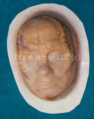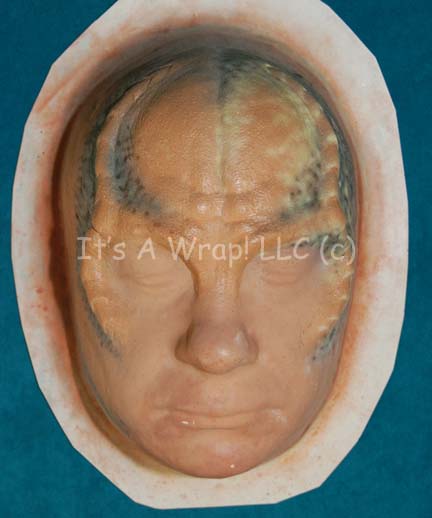 Description: A trio of plastic casts of actor John Billingsley’s face used to test the special effects make up used to create the character of “Dr. Phlox” on Star Trek: Enterprise. All three items include applied special effects make-up head ridges which are in good condition and are painted in lifelike hues of flesh tone with spots and speckles. The items feature only the slightest wear from storage conditions in the vein of where small points of the make-up pulled away. The items measure approx. 13 X 9.75 X 5 inches each.