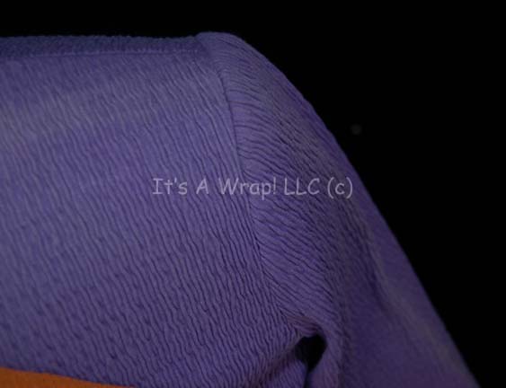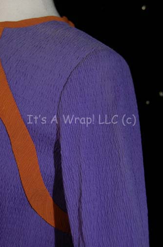 Description: A Bajoran themed surgical gown featured variously in episodes of Star Trek: Deep Space Nine. The item is colored purple, made from textured fabric with gold colored stripes. It is open down the back with multiple string ties and comes with a costumer’s tag reading ‘Bajoran Surgical Gown’.