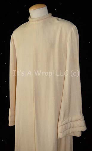 Description: A white colored Vulcan robe like those appearing in Star Trek III: The Search for Spock. The item is full length with a zip up the spine. The sleeves are kimono style with rings sewn into the cuffs. Robes like these can be paired up to sashes for women, and drapes for men.