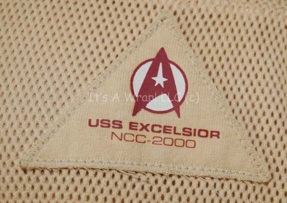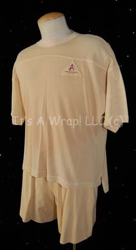Description: A costume feature in Star Trek VI: The Undiscovered Country for wear by crewmen on board the “U.S.S. Excelsior”. The costume is a set of cream colored shorts with an elastic waist and a matching mesh style short sleeved shirt with a fabric logo triangle affixed to the left breast featuring a graphic of the Starfleet emblem, reading ‘U.S.S. Excelsior NCC-2000’. The shirt features a name brand and a size tag indicating it to be a ‘L/XL’.