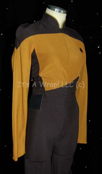 Description: This Starfleet uniform jumpsuit consists of black shoulders with an Operations Gold chest, back, sleeves, and piping around the Mandarin collar; a black waist and legs that end in stirrups. This particular uniform has zips that close the front of the costume and features a Velcro patch on the left breast for a commbadge (sold separately) and a second one on the right thigh for ‘away team gear’. There is a hole between the legs of the garment just big enough to get a finger through but can be easily repaired. A sewn in tag sets the size at ‘34’ and the number at ‘208’.