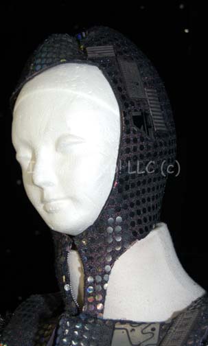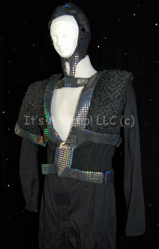 Description: A costume featured in the Star Trek: Deep Space Nine episode “Rules of Acquisition”; wherein “Quark” (Armin Shimerman) is ordered by the Grand Nagus to open up the first trade negotiations with a Gamma Quadrant species, the “Dosi”. This costume consists of long-sleeved, full-length, black jumpsuit that is open halfway down the front and back, a black, neoprene belt and bandolier featuring a design of small, iridescent silver-colored circles and resin-cast rectangles with applications meant to denote circuitry, woven metal along the shoulders making the bandolier into a vest, and a matching skull cap. A sewn in Deep Space Nine in the jumpsuit reads ‘Mr. A. Bragg’, a sewn in Deep Space Nine tag in the skullcap reads ‘Allan Bragg’, a sewn in Star Trek: TNG tag in the vest reads ‘Allan Bragg’ and is written directly on the garment as well.