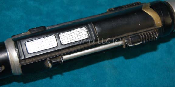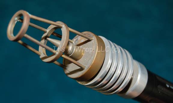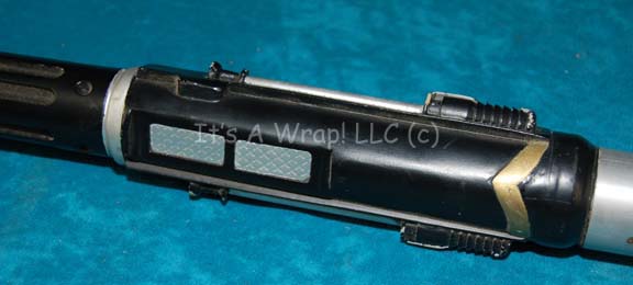 Description: A prop Klingon painstik like those featured in the Star Trek: The Next Generation episode “Reunion”. The item is a silver colored metal rid with black colored Klingon iconographic lettering adhered to it, with a black colored molded resin grip at the fore, and a fashioned metal electrode prod end. The item is painted with metallic gold and silver accents to suggest hardware and measures approx. 30.5 X 1.5 inches diameter. In near perfect condition this item depicts only the slightest of chipped paint and scuffing in the metal. An excellent item to be certain.