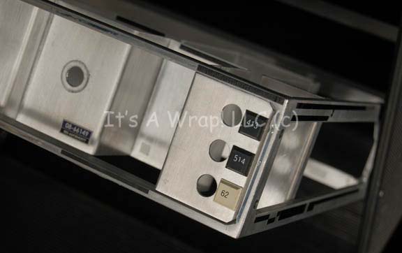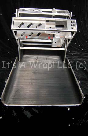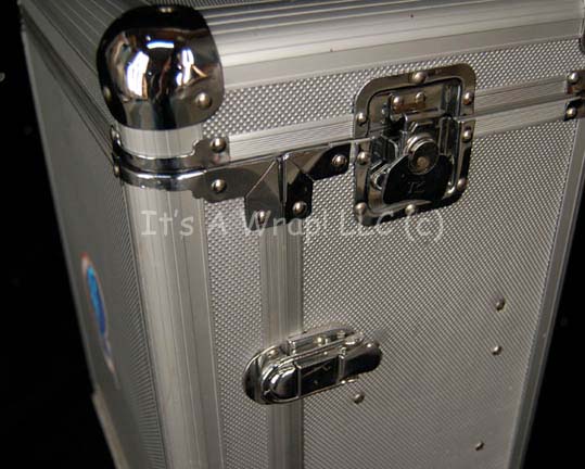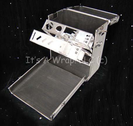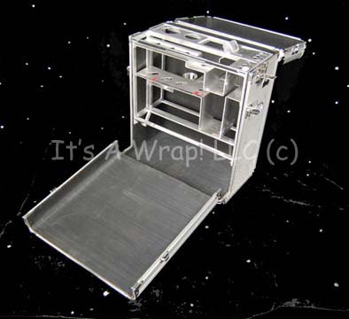Description: A medium sized prop tool box featured in the Star Trek: Enterprise episode “Minefield” for use by “Malcolm Reed” (Dominc Keating) and “Captain Archer” (Scott Bakula). The item is a heavy duty plastic case with a hinged top lid and a hinged side wall. The item is metallic silver colored all the way round externally with a pair of “Enterprise NX-01” assignment applications adhered to the front and reverse. Actual metal corner covers reinforce the edges. The lid opens by way of butterfly clips and the wall opens by way of flip latches to reveal two internally positioned hinged tool brackets. The brackets are silver colored polished metal with holes for tools that are not present. They are adorned with rubber faux buttons and inventory applications. The entire interior is lined with black rubber coating to protect the contents. Closed, the item measures approx. 15.5 X 19 X 10 inches. The top features an industrial strength metal handle with rubberized grip. Externally, the item was inscribed with packing information during set strike reading ‘P-5’.