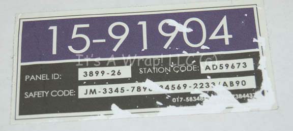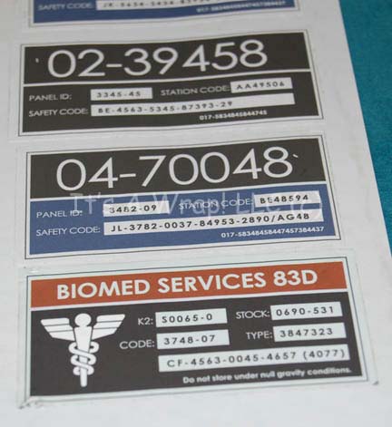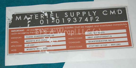 Description: A set seven of carefully removed Starfleet inventory applications which were painstakingly removed from set pieces prior to strike. Five of the items are multicolored and depict numeric values with identifiers for ‘Safety Code’, ‘Station Code’, and ‘Panel ID’. One of the applications is the same size as the aforementioned ones and reads ‘BIOMED SERVICES 83D’ and features a graphic of a white medical cadesus. The large application reads ‘Material Supply Command’ and describes inventory information; it suffered a degree of scuffing prior to removal but is generally intact. This item measures approx. 8.25 X 3.25 inches, the upper left corner is damaged. The other applications measure approx. 3.75 X 1.75 inches. All of the items were removed immediately from set consoles or wall panels that are not available in the collection; they were applied to wax coated paper made specifically for easy peel off of stickers. The items depict only the slightest degree of creasing and some have lost a degree of adhesive quality. Some retain a degree of paint on their adhesive side that came away with them. The items are in no way guaranteed to have appeared on screen, but given their placement on material used on the set of Star Trek: Enterprise they are authentic and in used condition.