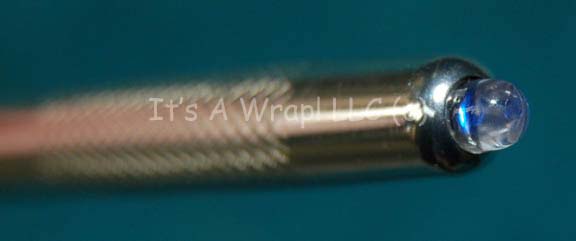 Description: A hand held blue light like the one featured in the Star Trek: Enterprise episode “Proving Ground”. The item appeared as a light and as an engineering tool in the same episode, once by “Malcolm Reed” (Dominic Keating) when he used it to align the “Enterprise NX-01” sensor assembly, and again when “Commander Tucker” (Connor Trinneer) held it in his teeth while working on a damaged monitor array. The item is a polished silver m metal light pen with a etched grip in the stem and screw on battery cap. The item activates by way of a thumb button on the end or by screwing the battery cap in all the way. The item is powered by two AAAA sized 1.5volt batteries held internally which retain power from production use. A pair of unused Energizer E-Squared Titanium batteries were located with the item and are accompanying, both the used and unused batteries exhibit a degree of corrosion. The item measures approx. 5 X 0.25 inches diameter.