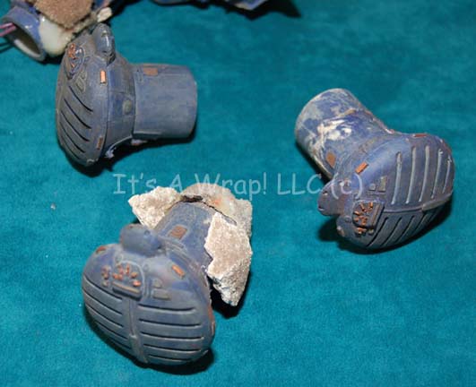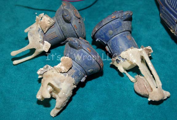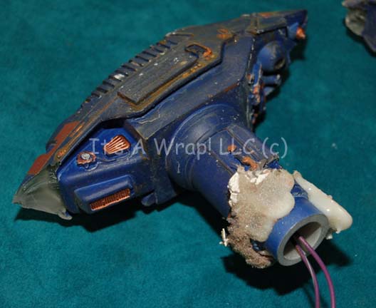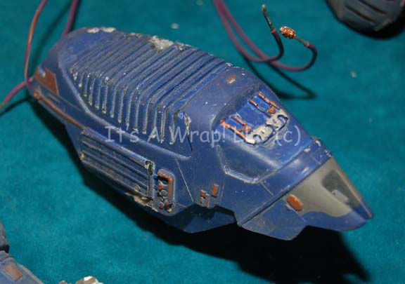 Description: A lot of ten specialized pieces to the Ketricel-White facility model appearing in the Star Trek: Deep Space Nine episode “A Time To Stand”. The items were part of the asteroid facility model which was made from foam that sadly did not survive years of storage, yet these pieces were removed. They are composed of specialized translucent acrylic painted purple with other painted accents to suggest hardware. The items are molded to represent external exhaust ports, or tactical positions, or weapons placements and come in two configurations. Four of them are made to appear oblong and, the other six are mushroom shaped. They all jutted out asymmetrically from the asteroid base and were lit by internal electronic bulbs that connected deep within the model. Some of the electronic elements still remain in the way of light bulbs and wires. In fact, the non-electronically imbued pieces can be lit from within by a small diode or tiny flashlight. The mushroom shaped items measure approx. 1.75 X 2, the other pieces are 2 X 5.5 X 3.75 inches. Some retain wiring and adhered foam remains from the model. Screen captures provided reveal the items as the glowing features in around the bottom of the shot.