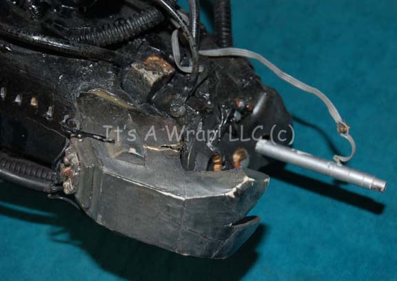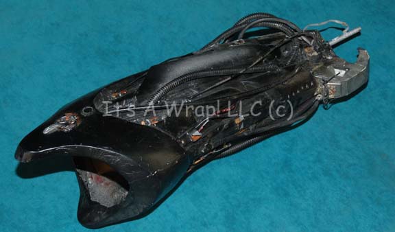 Description: A prop Borg arm created for use in Star Trek episodic television and feature films. The item is molded resin with multiple additional materials mounted internally and externally. The item features a soft foam lining internally to protect the wearer; a bar is mounted inside the end for the wearers hand to grasp. Tubes, conduit covers, wires, and other accents are affixed externally to suggest hardware. The item features one part of a claw on the end made from molded foam rubber, and a metallic silver colored rod just from the end as well. The item measures approx. 21 X 8.25 X 6 inches and is perfect for an already existing Borg costume or an excellent addition to a prop collection.