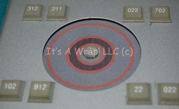Description: A piece of set dressing featured in various episodes of Star Trek: Enterprise. This item was affixed to the Armory Torpedo Launch Tube doors and consists of a foam base attached to a silver-colored square metal plate with a hole cut in the middle to reveal a blue-gray application with red stripes and a clear rubber button meant to be an ‘electric eye’ in the center. In each corner there are two gray, rubber, faux buttons with numerical values. The item measures approx. 6 ½ x 6 inches.